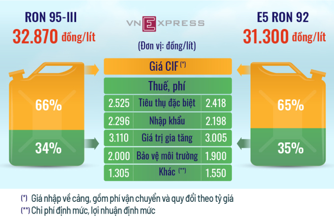 Ước tính tỷ trọng các loại thuế, chi phí trong mỗi lít xăng được điều chỉnh từ 21/6. Đồ họa:Tạ Lư