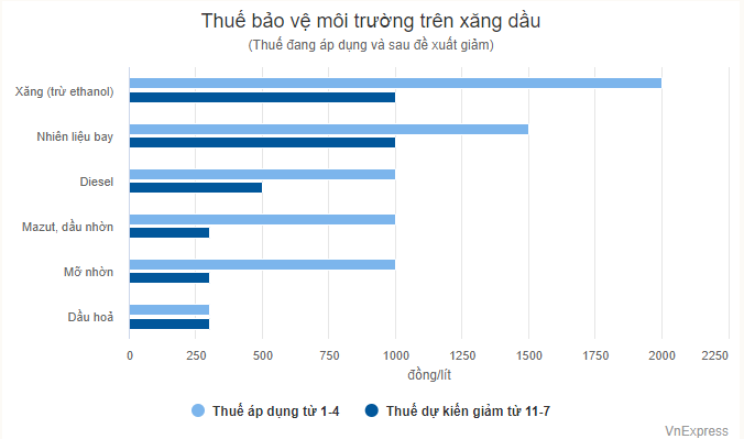 Trước đó, theo đề nghị của Bộ Tài chính, thuế bảo vệ môi trường sẽ giảm về mức sàn theo thẩm quyền quyết định của Uỷ ban Thường vụ Quốc hội. Cụ thể, thuế này với xăng sẽ giảm từ 2.000 đồng xuống 1.000 đồng một lít. Tức là tới tay người tiêu dùng, giá xăng sẽ giảm tương ứng 1.100 đồng một lít, gồm thuế VAT. Các loại dầu, mỡ khác giảm 500-700 đồng một lít.