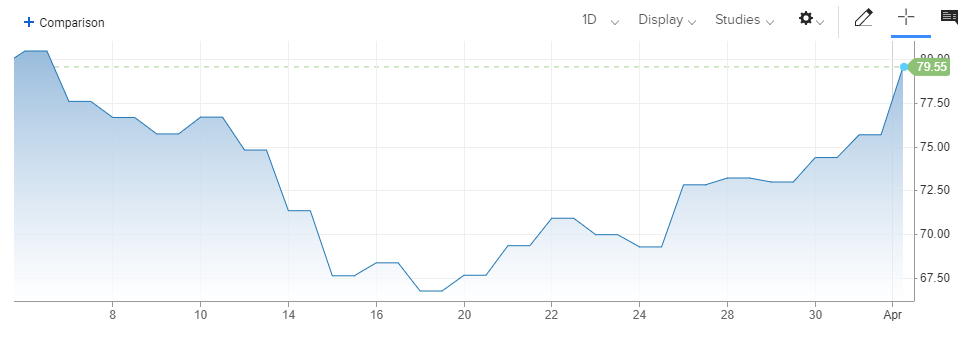 Diễn biến giá dầu thô Mỹ WTI trong một tháng qua. Biểu đồ: CNBC