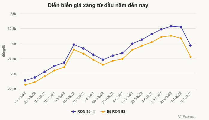 Tại kỳ điều hành 11/7, mỗi lít xăng đã giảm 3.090-3.110 đồng, còn các mặt hàng dầu cũng hạ 800-3.020 đồng. Theo đó, giá xăng E5 RON 92 về 27.780 đồng, xăng RON 95-III là 29.670 đồng một lít. Dầu diesel là 26.590 đồng một lít, giảm 3.020 đồng. Dầu hỏa có mức giá mới là 26.340 đồng…