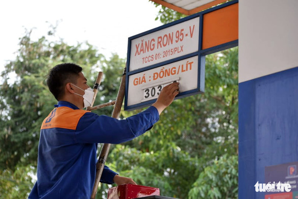 Nhân viên cây xăng một cây xăng ở quận 4, TP.HCM thay đổi giá xăng mới lúc 15h chiều 11-3 – Ảnh: NGỌC PHƯỢNG