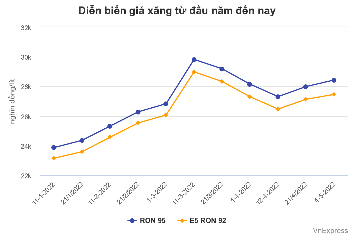 Từ 15h ngày 04/05/2022, mỗi lít xăng E5 RON 92 tăng 330 đồng, RON 95 tăng 440 đồng trong khi dầu diesel đắt thêm 180 đồng.