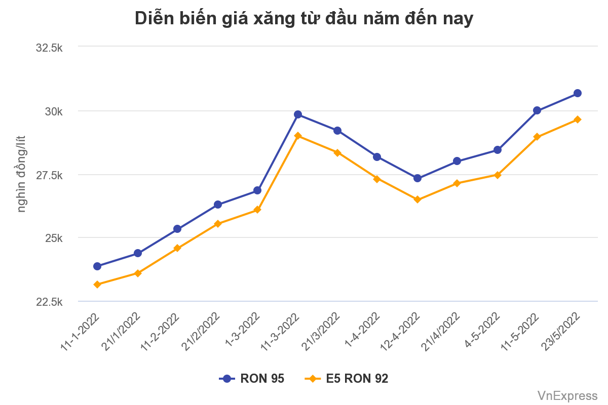 Liên Bộ Công Thương – Tài chính hôm nay tăng 680 đồng mỗi lít xăng E5 RON 92, tăng 670 đồng xăng RON 95. Đây là đợt tăng giá thứ tư liên tiếp từ 21/4 đến nay, và sau đợt tăng này, giá xăng RON 95-III đã lập đỉnh mới, lên 30.650 đồng một lít. Còn giá xăng E5 RON 92 là 29.630 đồng mỗi lít.