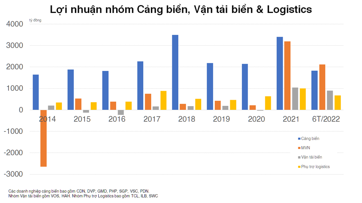 Thực tế thì từ năm 2021, MVN đã có sự hồi sinh ấn tượng với mức lợi nhuận xấp xỉ của nhóm 7 doanh nghiệp Cảng biển cộng lại. Đây cũng chính là nhóm những doanh nghiệp luôn thường xuyên có mức lợi nhuận tốt nhất trong nhóm Cảng biển, Vận tải biển và Phụ trợ Logistics.
