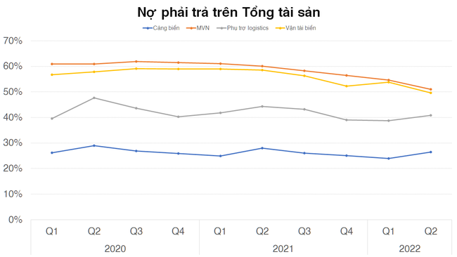 Với kết quả kinh doanh tích cực, các doanh nghiệp ngành đều cải thiện sức khỏe tài chính tốt hơn. Hiện nợ phải trả của Cảng biển chiếm 26% tổng tài sản, nhóm Phụ trợ Logistics chỉ là 40%, Vận tải biển là 50%. Kể cả MVN đã giảm tỷ lệ xuống 51% trong quý 2/2022.