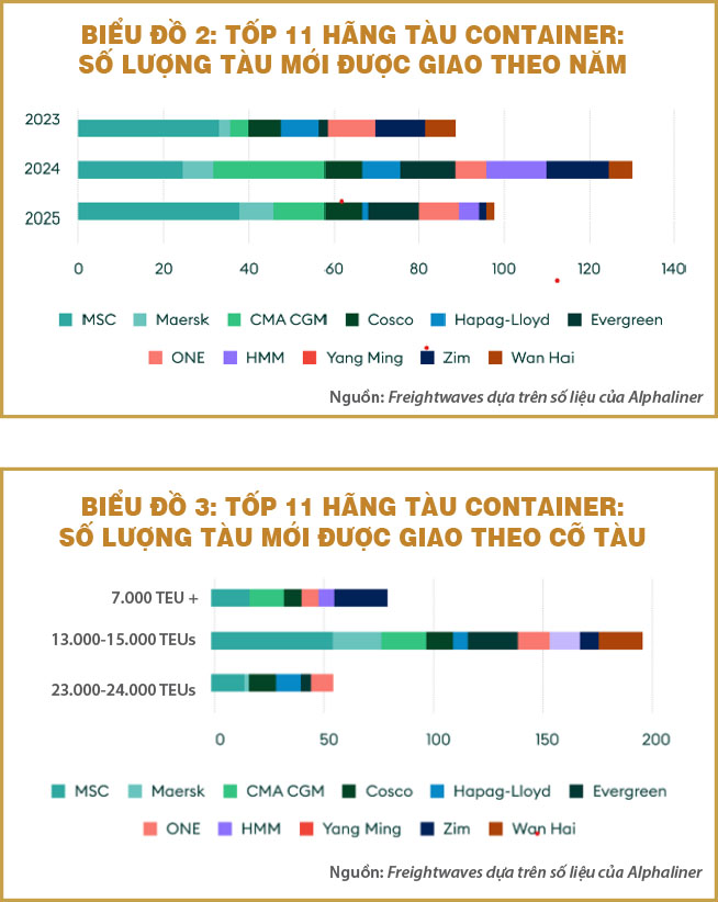 Xét về cỡ tàu thì số lượng tàu đóng mới loại “Megamax” lớn nhất thế giới hiện nay với sức chở 23.000-24.000 TEU cho tuyến hải hành Á – Âu chiếm đến 23%, loại “Neopanamax” 13.000-15.000 TEU (lớn nhất có thể vượt kênh đào Panama) cho tuyến Á – Bắc Mỹ chiếm 60%, và loại còn lại 7.000+ TEU chiếm 17%.