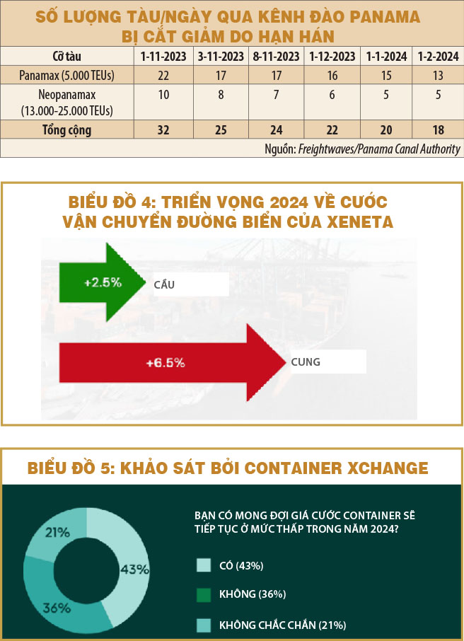 Do tình hình hạn hán, kể từ tháng 11-2023 lượng tàu qua kênh đào đã bị cắt giảm từ 32 tàu/ngày xuống còn 24 tàu/ngày, và sẽ chỉ còn 18 tàu/ngày từ 1-2-2024. Hai liên minh THE và OCEAN đã thông báo chuyển hướng lộ trình một số tuyến dịch vụ Á – Bờ Đông Mỹ qua kênh đào Suez.